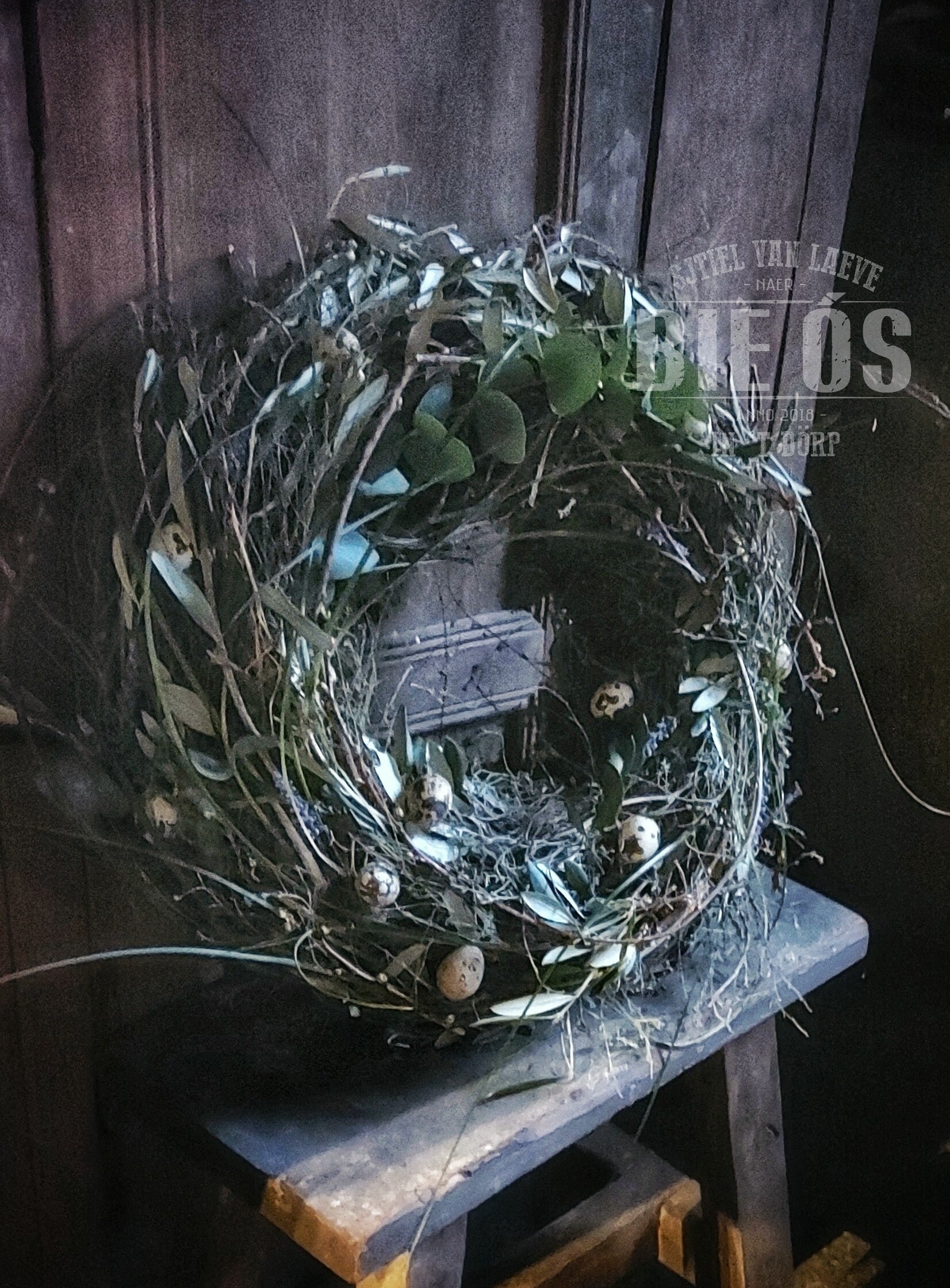 Dubbel gebonden voorjaarskrans, op een basis van stro, omwikkeld met mos, omwikkeld met wilde tijm, olijf, eucalyptus en afgewerkt met takken, eitjes en veertjes